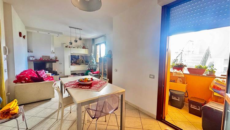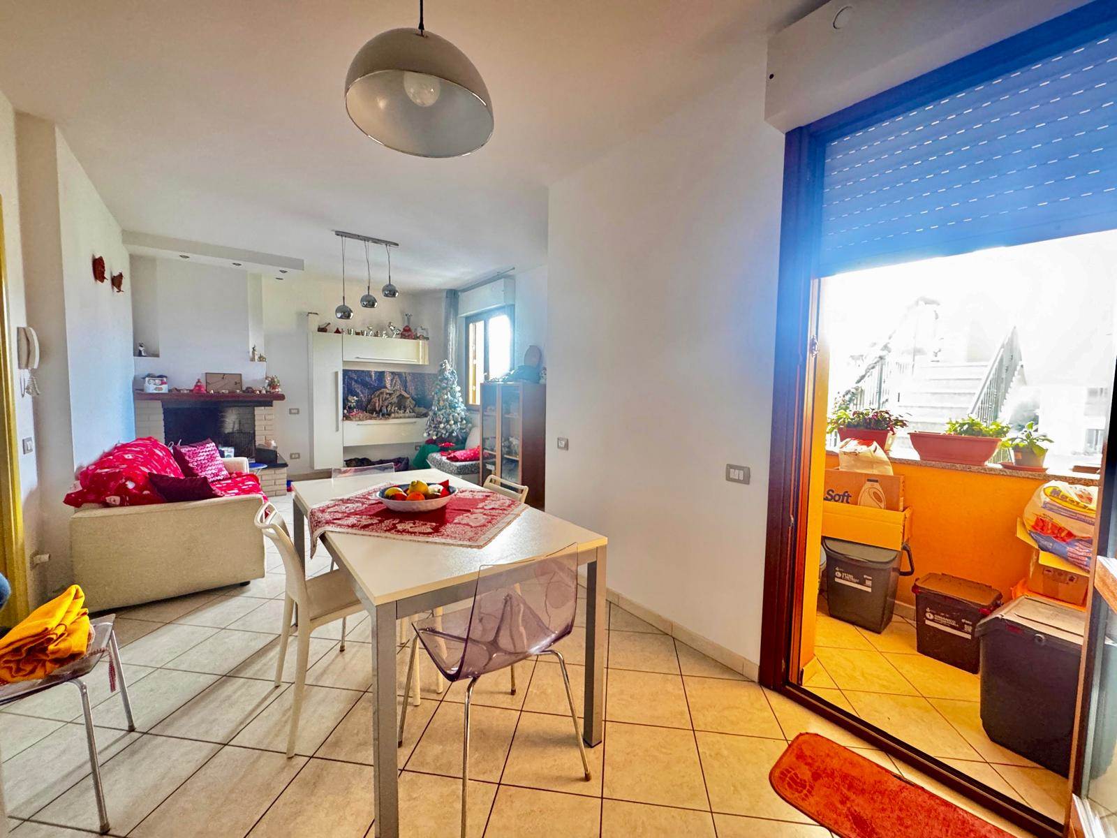 Ingresso tramite portone su zona giorno ampia e luminosa con camino e cucina lineare a vista ed uscita sulla prima verandina;